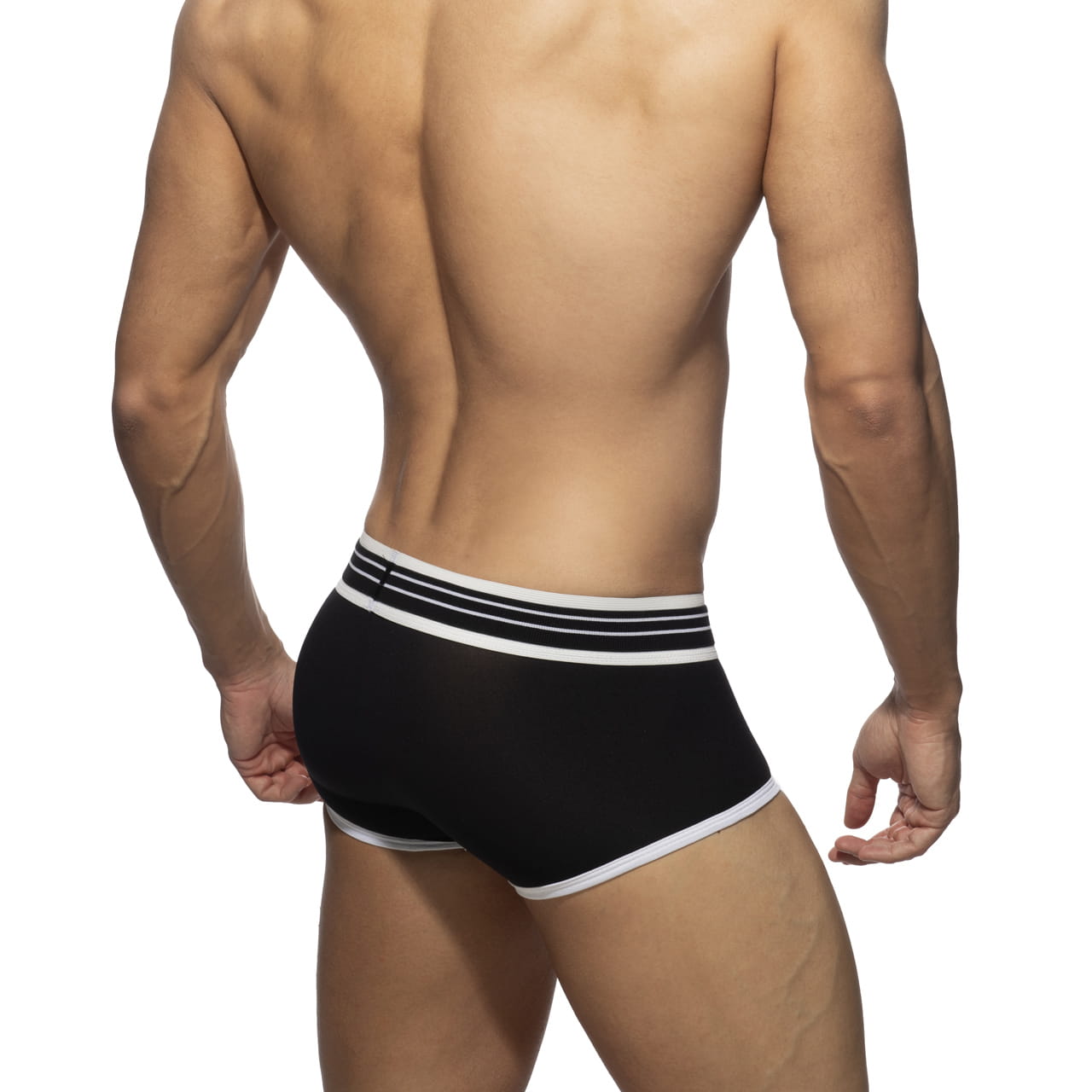 Addicted Double Trouble Black to klasyczne bokserki trunk o minimalistycznym, sportowym wyglądzie. Materiał w kolorze czarnym został uzupełniony kontrastowymi białymi lamówkami przy nogawkach i na panelu przednim. Pas w talii ma kolor czarny z białymi paskami biegnącymi dookoła. Na środku pasa umieszczono silikonowe logo AD w dopasowanym kolorze. Lekki i oddychający materiał jest delikatnie transparentny, dzięki czemu zapewnia komfort przez cały dzień.